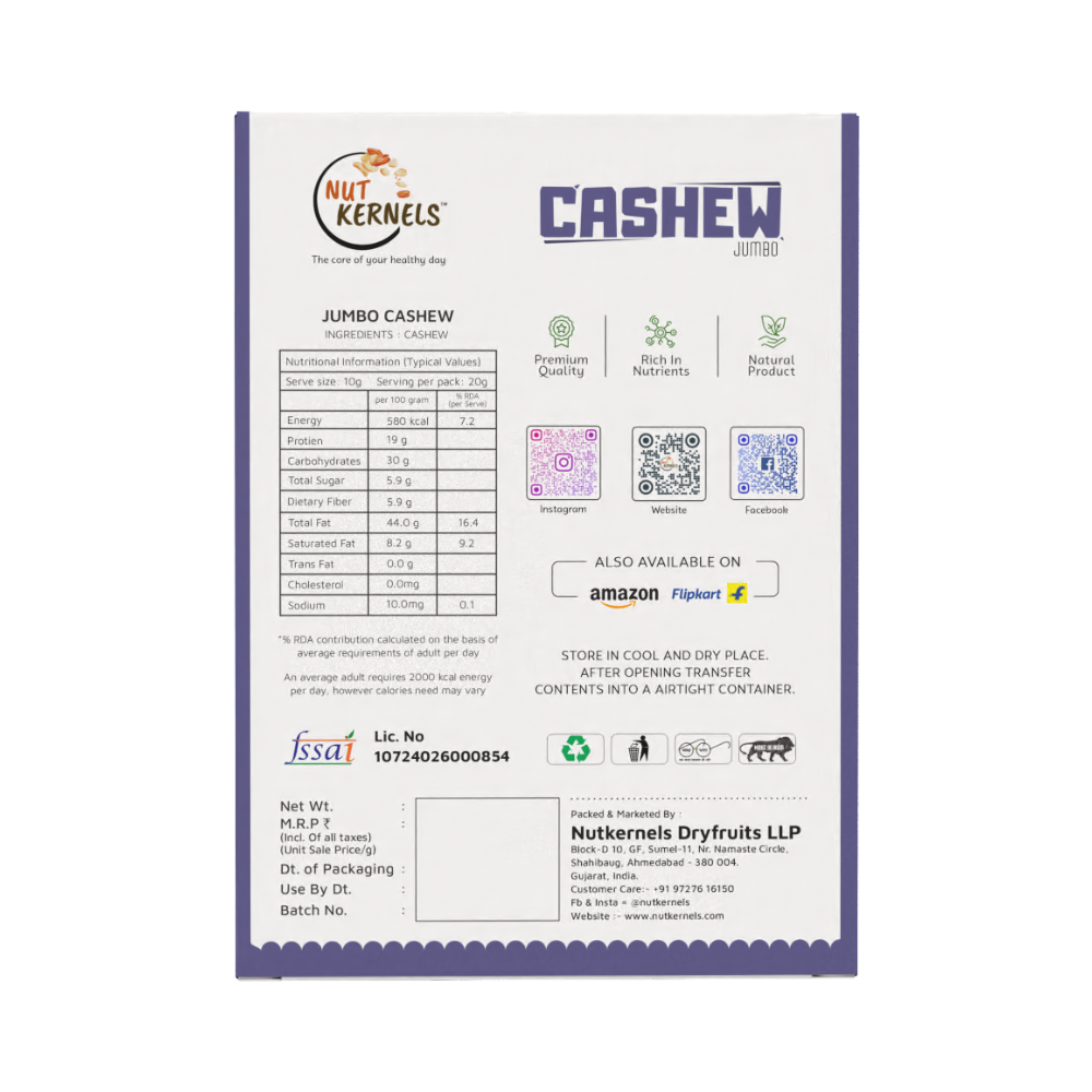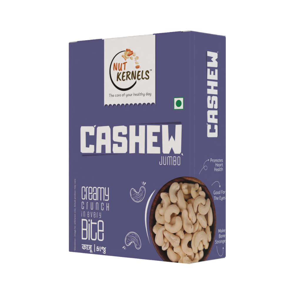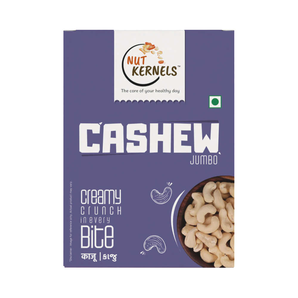 NutKernels Jumbo Cashew Nuts are premium, king-size kaju with a naturally rich, buttery taste and satisfying crunch, perfect for everyday snacking and gourmet recipes. Carefully sourced and hygienically packed, they bring you a wholesome blend of taste, nutrition, and indulgence in every handful.