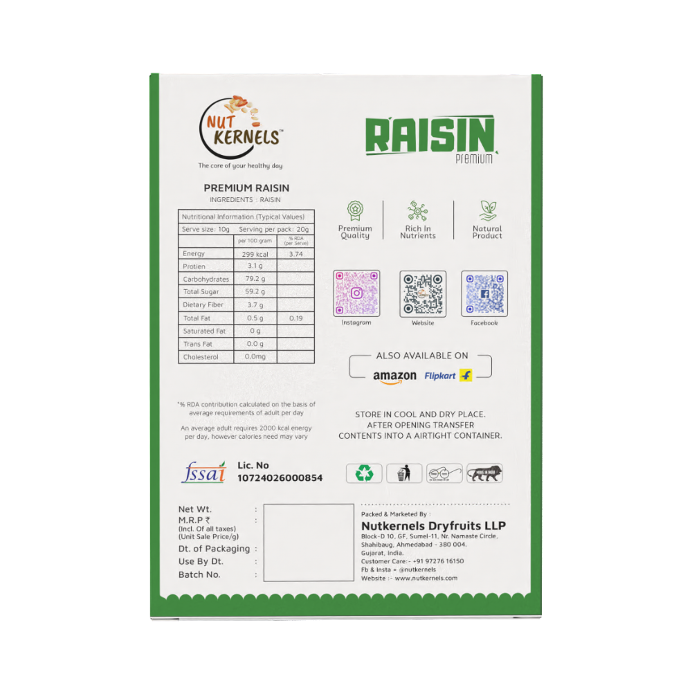 Store in a cool, dry place to preserve freshness and natural sweetness. Nutkernels raisins are carefully sourced and shade-dried for optimal taste and quality.